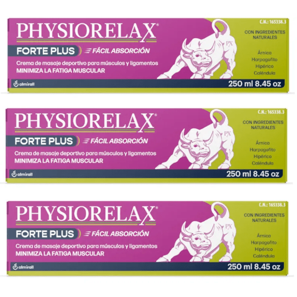 https://www.mifarma.eu/physiorelax-forte-plus-cream-3x250-ml775463938897Physiorelax Forte Plus Cream 3x250 ml<p><span style="font-weight: bold;">Physiorelax Forte Plus Cream 3x250ml Savings Pack</span></p><p> Sports massage cream with rosehip.</p><p> The natural properties of devil's claw, arnica, calendula and St. John's wort extracts provide a feeling of toning, relaxation and freshness in muscles and ligaments.</p><p> - <span style="font-weight: bold;">Devil's claw</span> : the effectiveness of natural extracts from its root for body massages has been demonstrated.</p><p> - <span style="font-weight: bold;">St. John's wort and arnica</span> : the natural extracts of these two plants help to relax muscles and ligaments.</p><p> - <span style="font-weight: bold;">Calendula</span> : its natural properties promote skin toning.</p><p> - <span style="font-weight: bold;">Rosehip:</span> its oil, with high contents of Omega-3 and Omega-6 fatty acids, facilitates skin care.</p><p> - <span style="font-weight: bold;">Mint</span> : its natural properties provide a feeling of freshness.</p><p> The objective of this enrichment with rosehip is twofold: To care for the physiotherapist's hands, since they are their working tool and sometimes the use of creams and soaps with very aggressive chemical agents can damage them.</p><p> It is recommended to hydrate, tone, nourish and regenerate the skin of the area treated with Physiorelax, thanks to the properties of rosehip oil.</p>https://assets.atida.com/transform/4bcae171-ccf7-4a2d-8654-9d50feaf6d04/Physiorelax-Forte-Plus-Crema-3x250-ml?io=transform:extend,width:250,height:25073.99instock9061.1487593305791816.01Physiorelaxhttps://www.mifarma.eu/media/catalog/product/4/4/2/3/442308cbc15d69aad7af1b23fd873e26514f19dc_Physiorelax_Forte_Plus_Crema_3x250_ml.png/Mini Prices/Savings Packs/Health and Hygiene Packs/Savings Packs/Health and Hygiene/Health and Hygiene/Body Care2026-04-15T00:10:23+0000