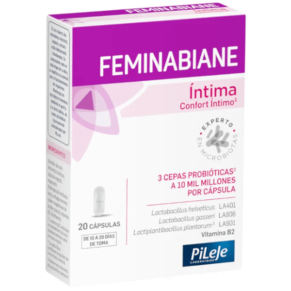 https://www.mifarma.eu/pileje-feminabiane-intimate-20-capsules639528250367Pileje Feminabiane Intimate 20 Capsules<p><span style="font-weight: bold;">Pileje Feminabiane Intimate 20 Capsules</span></p><p> Dietary supplement formulated with a careful selection of <span style="font-weight: bold;">three probiotic strains</span> recognized for their health benefits.</p><p> <span style="font-weight: bold;">Lactobacillus helveticus LA401, Lactobacillus gasseri LA806 and Lactiplantbacillus plantarum LA801</span> are found in a dose of <span style="font-weight: bold;">10 billion microorganisms per capsule,</span> guaranteeing high efficacy.</p><p> Probiotics are <span style="font-weight: bold;">live microorganisms</span> that, when administered in adequate amounts, help <span style="font-weight: bold;">balance intestinal flora</span> and thus promote a <span style="font-weight: bold;">healthy digestive system.</span></p><p><span style="font-weight: bold;">