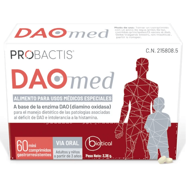 https://www.mifarma.eu/probactis-daomed-neutral-flavor-60-mini-tablets181283871451Probactis Daomed Neutral Flavor 60 Mini Tablets<p><span style="font-weight: bold;">Probactis Daomed Neutral Flavor 60 Mini Tablets</span></p><p> <span style="font-weight: bold;">Probactis DAOmed</span> is a food designed for <span style="font-weight: bold;">special medical uses</span> , formulated with the <span style="font-weight: bold;">enzyme Diamino Oxidase (DAO)</span> .</p><p> This product comes in mini-tablet form and is <span style="font-weight: bold;">suitable for adults and children over 3 years of age,</span> making it an affordable option for a wide audience.</p><p> One of the most notable features is its <span style="font-weight: bold;">gastro-resistant tablet formulation.</span> This means that <span style="font-weight: bold;">the DAO enzyme is not released in the stomach</span> , but is activated in a delayed manner <span style="font-weight: bold;">in the small intestine,</span> where it can effectively exert its beneficial effects. This feature is essential to ensure that the enzyme reaches the place where it is needed, thus optimizing its function.</p><p> <span style="font-weight: bold;">The enzyme diamine oxidase</span> is highly active and bioavailable, making it an ideal tool for <span style="font-weight: bold;">the long-term dietary management of DAO deficiency.</span> This deficiency can lead to a <span style="font-weight: bold;">range of histamine-related ailments, and DAO supplementation can help mitigate these effects,</span> thus improving the quality of life of those who suffer from it.</p><p> The development of Probactis DAOmed is based on solid scientific and clinical evidence, meeting the highest quality standards in the field of medical nutrition. This ensures users are choosing a product that is not only effective but also safe and backed by reliable research.</p>https://assets.atida.com/transform/7d4edd85-a7c7-4a69-9679-6dbd8476b5a6/Probactis-Daomed-Sabor-Neutro-60-Mini-Comprimidos?io=transform:extend,width:250,height:25027.99instock27.9925.44545354545500Probactishttps://www.mifarma.eu/media/catalog/product/2/7/f/6/27f69716a1846263a8de708324b2bd6f8e819db2_Probactis_Daomed_Sabor_Neutro_60_Mini_Comprimidos.png/Vitamins and Supplements/Supplements/Digestive System/Vitamins and Supplements/Vitamins and Supplements/Supplements2025-10-08T23:48:10+0000