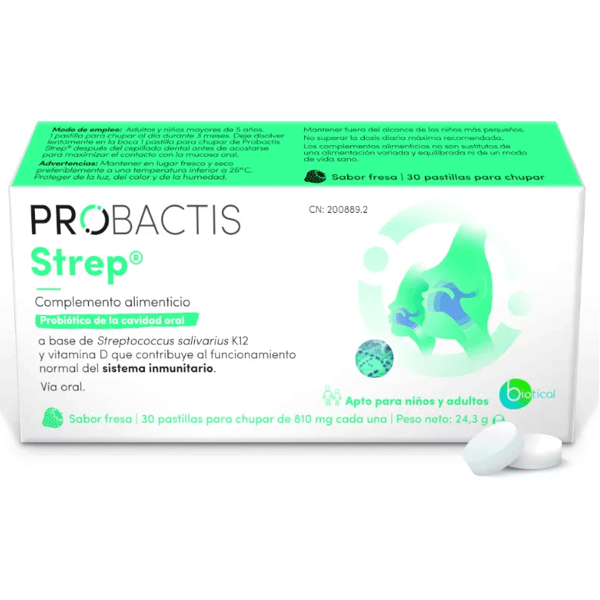 https://www.mifarma.eu/probactis-strep-strawberry-flavor-30-lozenges102796229936Probactis Strep Strawberry Flavor 30 Lozenges<p><span style="font-weight: bold;">Probactis Strep Strawberry Flavor 30 Lozenges</span></p><p> <span style="font-weight: bold;">Probactis Strep</span> is presented as an innovative <span style="font-weight: bold;">oral probiotic</span> designed to <span style="font-weight: bold;">strengthen the health of the oropharynx.</span></p><p> Formulated with the <span style="font-weight: bold;">exclusive strain Streptococcus salivarius K12</span> , this product stands out for its unique ability to <span style="font-weight: bold;">strengthen the natural defenses of the ear, nose and throat</span> .</p><p> Additionally, Probactis Strep includes <span style="font-weight: bold;">vitamin D3</span> , an essential nutrient that plays a crucial role in the proper functioning of the <span style="font-weight: bold;">immune system.</span> Vitamin D3 not only contributes to the body's defenses but also <span style="font-weight: bold;">promotes overall health</span> , helping to <span style="font-weight: bold;">maintain well-being during times of increased risk of infection</span> .</p><p> The product is designed for use by <span style="font-weight: bold;">adults and children over 5 years old,</span> offering a practical and effective solution.</p><p> <span style="font-weight: bold;">Lozenges</span> that dissolve easily in the mouth, making them easy to swallow and convenient to incorporate into your daily routine.</p><p> With its focus on <span style="font-weight: bold;">infection prevention,</span> Probactis Strep is an ideal choice for those looking to proactively <span style="font-weight: bold;">take care of their oral and respiratory health</span> .</p>https://assets.atida.com/transform/47e4da8b-af59-4b55-8989-c5bb8cbb4d62/Probactis-Strep-Sabor-Fresa-30-Pastillas-Chupar?io=transform:extend,width:250,height:25017.99instock22.5516.354544454545204.56Probactishttps://www.mifarma.eu/media/catalog/product/1/9/7/1/19715e515300bf8c1eefe92346505d154dd89eb1_Probactis_Strep_Sabor_Fresa_30_Pastillas_Chupar.png/Vitamins and Supplements/Vitamins and Supplements/Supplements/Vitamins and Supplements/Vitamins (A-K)/Mifarma Days NO2025-10-02T23:44:47+0000