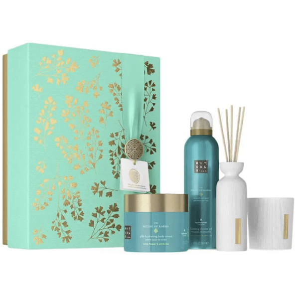 The luxurious Ritual of Karma gift box offers a unique sensory experience, combining the refreshing aroma of the lotus flower with the subtlety of white tea.