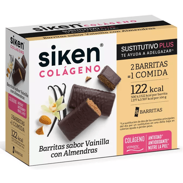 https://www.mifarma.eu/siken-substitutive-collagen-bar-vanilla-8-units490561240543Siken Substitutive Collagen Bar Vanilla 8 Units<p><b><span>Siken Substitutivo Colágeno</span></b> <span>is a <b>bar</b> with a pleasant <b>vanilla flavor with almonds.</b> <o:p></o:p></span></p><p> <span>Ideal to drink between meals.<o:p></o:p></span></p><p> <span>Perfect for those who want to stay in shape.<o:p></o:p></span></p><p> <span>Contains <b>13 vitamins, 15 minerals and collagen</b> to benefit the body.<o:p></o:p></span></p><p> <span>Contribution of 244 Kcal for 2 bars.</span></p><p> Box with <span>8 bars.</span></p>https://assets.atida.com/transform/49a84289-e389-41c1-b241-244113560048/Siken-Sustitutivo-Colageno-Barrita-Vainilla-8-Uds?io=transform:extend,width:250,height:25014.99instock15.9913.62727172727361Sikenhttps://www.mifarma.eu/media/catalog/product/5/0/a/8/50a81ae71ae300d9bb125a47ab24a1610b46ba0b_Product_Tile_Thumbnail_Siken_Sustitutivo_Colageno_Barrita_Vainilla_8_Uds.png/Feeding/Weight Loss/Weight Loss/Satieters/Vitamins and Supplements2024-09-16T05:59:32+0000
