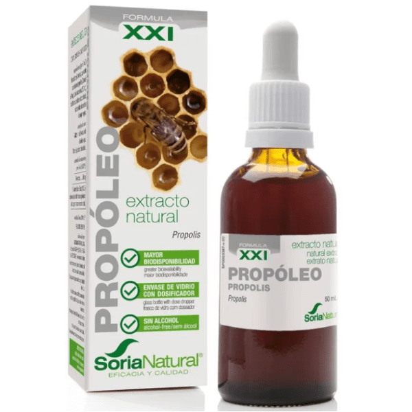 https://www.mifarma.eu/soria-natural-formula-xxi-extract-natural-propolis-50ml846140501802Soria Natural Formula XXI extract Natural Propolis 50ml<p>New formulation XXI that concentrates a number of advantages over conventional extract:</p><p> -Greater solubility thanks to a manufacturing in aqueous phase.</p><p> -Greater bioavailability due to with Cyclodextrin encapsulation technique which increases the absorption of the body</p><p> -Better taste as a result of natural sweetness that brings the Glycerin and the masking effect of encapsulation in Cyclodextrin.</p><p> -Absence of alcohols</p><p> This product of Soria Natural is made from a manufacturing process that manages to concentrate the active principles of 6 to 25 times more than the usual methods.</p><p> It is obtained from propolis extract and Glycerin plant, which by its physical properties, acts as a preservative without affecting the basic components, which guarantees a minimum shelf-life of 3 years.</p><p> Indicated for respiratory disorders, colds, flu, sinusitis and ear infections, throat and mouth.</p><h3 id= w_modo-de-empleo > <b>How to use</b></h3><p> Adults: take 25 drops, 3 times a day diluted in a little water.</p><p> Children: up to 5 years 8 drops 3 times a day, between 5 and half of the intake of an adult (22-23 drops) 3 times a day.</p>https://assets.atida.com/transform/03831274-1d12-4f7e-93d6-a7e81878b791/Soria-Natural-Formula-XXI-Extracto-Natural-Propolis-50-ml?io=transform:extend,width:250,height:2507.99instock15.167.2636353636364477.17Soria Naturalhttps://www.mifarma.eu/media/catalog/product/e/b/c/b/ebcbd4ec0307905b8fd9c7d3c7b3602236e7fd1f_Product_Tile_Thumbnail_Soria_Natural_Formula_XXI_Extracto_Natural_Propolis_50_ml.png/Respiratory System/Up to 70% off/Vitamins and Supplements/Mifarma Days NO/Special price Soria Natural2024-09-16T06:19:43+0000