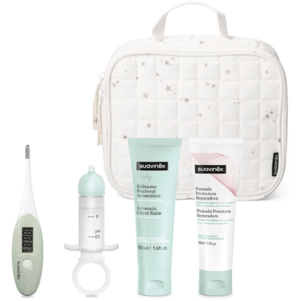 - An aromatic chest balm, a nasal cleanser with two silicone tips, a regenerating protective ointment and a flexible digital thermometer , all presented in an attractive toiletry bag decorated with little stars.