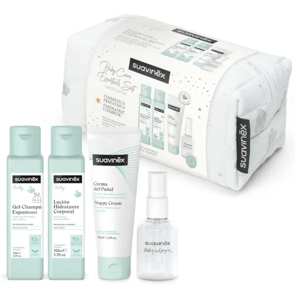 The Suavinex travel bag contains a set of four travel-sized products for baby skin care and hygiene . It includes a 50 ml baby cologne , a 100 ml foaming gel-shampoo , a 75 ml diaper cream, and a 100 ml moisturizing lotion .