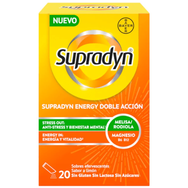 https://www.mifarma.eu/supradyn-energy-double-action-lemon-flavor-20-sachets 557010899690 Supradyn Energy Double Action Lemon Flavor 20 Sachets <p><span style="font-weight: bold;">Supradyn Energy Double Action Lemon Flavor 20 Sachets</span></p><p> Your perfect ally to face the challenges of everyday life with a double promise: <span style="font-weight: bold;">combat stress and boost your energy</span> .</p><p> Thanks to carefully selected ingredients, this supplement helps you <span style="font-weight: bold;">better manage emotional stress and irritability thanks to rhodiola and lemon balm,</span> components known for their properties in maintaining mental well-being.</p><p> Not only does it focus on your <span style="font-weight: bold;">emotional well-being,</span> but it also gives you that <span style="font-weight: bold;">boost of energy and vitality</span> you need.</p><p> With a complex of <span style="font-weight: bold;">B vitamins and magnesium,</span> Supradyn Energy Double Action works to reduce tiredness and fatigue, recharging your batteries and allowing you to face each day with renewed strength.</p><p> Discover the perfect balance between mind and body, and say goodbye to stress while embracing a life full of energy and positivity.</p><p> With a pleasant <span style="font-weight: bold;">lemon flavor.</span></p><p> <span style="font-weight: bold;">Gluten, lactose and sugar free.</span></p><p> <span style="font-weight: bold;">Suitable for ages 18 and up.</span></p> https://assets.atida.com/transform/311f9c6e-401b-4c94-a8ee-5bc89d27208f/Supradyn-Energy-Doble-Accion-Sabor-Limon-20-Sobres?io=transform:extend,width:250,height:250 13.99 instock 17.38 12.718180818182 20 3.39 Supradyn https://www.mifarma.eu/media/catalog/product/2/1/b/f/21bfc6bcdb371763641ab6aa74b0249c6f899a92_Supradyn_Energy_Doble_Accion_Sabor_Limon_20_Sobres.png /Vitamins and Supplements/Supplements/Emotional Balance and Relaxation /Vitamins and Supplements /Vitamins and Supplements/Minerals /Vitamins and Supplements/Supplements /Vitamins and Supplements/Vitamins (A-K) /Mifarma Days NO /NO MIFARMA DAYS /Mifarma Days: Up to 70% off! 2025-06-25T23:54:21+0000