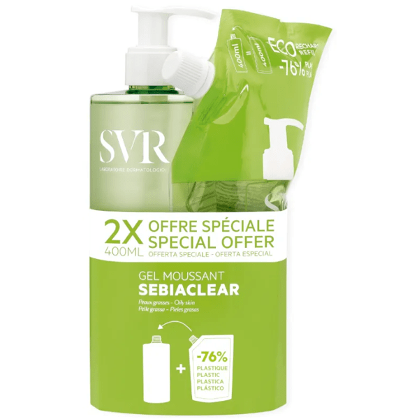 https://www.mifarma.eu/svr-sebiaclear-gel-moussant-400-ml-eco-refill-400-ml221851957638SVR Sebiaclear Gel Moussant 400 ml + Eco Refill 400 ml<p><span style="font-weight: bold;">SVR Sebiaclear Gel Moussant 400 ml + Eco Refill 400 ml</span></p><p> <strong>Soap-free</strong> foaming cleansing gel, ideal for removing impurities and excess sebum without drying out the skin.</p><p> Cleanses, refreshes, and soothes the skin. Unclogs pores.</p><p> Indicated for daily cleansing of oily and acne-prone skin.</p><p> Minimalist formula with only 10 ingredients and a high concentration of active ingredients.<br></p><p> Gluconolactone (8X more concentrated) purifies, unclogs pores and gives the appearance of clearer skin.</p><p> Salicylic Acid: exfoliates, tightens pores, regulates excess sebum and reduces blemishes.<br></p><p> Biodegradable formula with 95% ingredients of natural origin.</p><p></p><p> Very pleasant foaming texture. Easy to rinse, it leaves skin perfectly clean, fresh, and mattified.</p><p> <span style="font-weight: bold;">This pack contains a 400ml ECO refill</span></p>https://assets.atida.com/transform/63e72e7d-4c04-4008-af41-982078a84011/SVR-Sebiaclear-Gel-Moussant-400ml-Eco-Recarga-400ml?io=transform:extend,width:250,height:25022.99instock29.6418.999999226.65Laboratorios SVRhttps://www.mifarma.eu/media/catalog/product/d/7/b/1/d7b18d8b82f3d3a274eefd80befde04c54030eed_SVR_Sebiaclear_Gel_Moussant_400ml_Eco_Recarga_400ml.png/Cosmetics and Beauty/Cosmetics and Beauty/Body/Cosmetics and Beauty/Facial/Cosmetics and Beauty/Facial/Acne/Cosmetics and Beauty/Facial/Facial Cleansing/Health and Hygiene/Health and Hygiene/Body Care/Health and Hygiene/Body Care/Shower and Bath Gel2025-09-11T23:49:52+0000