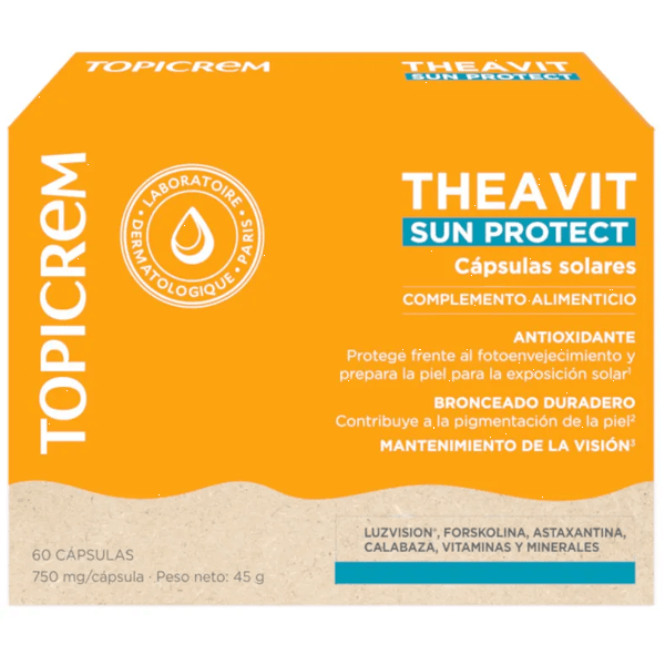https://www.mifarma.eu/topicrem-theavit-solar-30-capsules732993175043Topicrem Theavit Solar 60 Capsules<p><span style="font-weight: 700;">Topicrem Theavit Solar 60 Capsules</span></p><p> Food supplement to prepare the skin before sun exposure.<span style="white-space: pre;"> </span></p><p><span style="font-weight: bold;">Tan</span> activator, stimulates the skin's barrier function, antioxidant action, strengthens the skin's defenses, reduces cellular inflammation and protects the eyes, nervous system and prevents photoaging.</p><p> Aimed at people with sun intolerances or allergies, patients with photosensitizing treatments, users with high exposure to blue light, athletes and people who practice outdoor activities and the population with moderate to intense sun exposure.</p>https://assets.atida.com/transform/2a52f576-4c63-488e-8738-0f197cb21afe/Topicrem-Theavit-Solar-60-Capsulas?io=transform:extend,width:250,height:25028.99instock36.926.354544454545217.91Topicremhttps://www.mifarma.eu/media/catalog/product/e/e/e/5/eee5b75ce4f9c8e38f875ccb622c0f4b2ed8a4ff_Topicrem_Theavit_Solar_60_Capsulas.png/Master catalog/Atida Cash 5%/Master catalog/Master catalog/Health and Hygiene/Master catalog/Health and Hygiene/Sun Protection and Cream/Master catalog/Health and Hygiene/Sun Protection and Cream/Oral Capsules/Master catalog/cyber_monday_pt_int/Master catalog/Vitamins and Supplements/Master catalog/Mifarma Days NO2024-10-31T00:51:21+0000