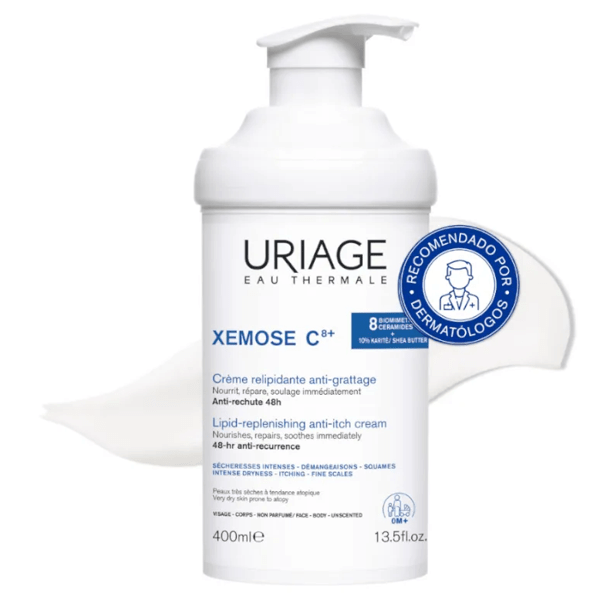 https://www.mifarma.eu/uriage-xemose-universal-emollient-cream-400ml707808627234Xemose C8+ Anti-itch Replenishing Cream 400 ml<p><span style="font-weight: 700;">Xemose C8+ Anti-itch Replenishing Cream 400 ml</span></p><p> XEMOSE C8+ anti-itch relipidizing cream repairs and soothes very dry skin prone to atopic dermatitis from the first application.</p><p> Suitable for the whole family.</p><p> It acts on the three weakened skin barriers in atopic skin: the microbial barrier, the physical barrier, and the immune barrier.<span style="white-space:pre"> </span></p><p>Formulated with 8 biomimetic ceramides, the cream increases both the quantity and diversity of ceramides in the skin.* Combined with the regenerating action of 10% shea butter, it effectively restores the physical barrier, leaving the skin intensely nourished and protected.</p><p> Increases microbiome diversity.</p><p> It acts on the immune barrier thanks to two exclusive patents from Laboratoires Dermatologiques d'Uriage: TLR2-REGUL and CHRONOXINE, which help limit itching and provide long-lasting relief.</p><p> The skin is repaired to reduce the intensity and frequency of itchy flare-ups due to dryness. Instant and long-lasting relief, with a feeling of comfort and protection. With 48h anti-recurrence**, the lipid-replenishing anti-itch cream improves the quality of life of atopic-prone skin.</p><p> Its fresh, light texture is non-greasy and non-sticky and absorbs quickly, allowing you to get dressed immediately.</p><p> Dermatologically tested on very dry, atopic-prone skin. For the whole family's skin, even the most sensitive. From birth.</p><p> *Test on skin explant</p><p> **Reduces the itching sensation</p>https://assets.atida.com/transform/7067b77b-495e-49e9-a7b2-93199bbc18ff/Xemose-C8-Crema-Relipidizante-Anti-picor-400-ml?io=transform:extend,width:250,height:25018.99instock27.4715.694213876033318.48Uriagehttps://www.mifarma.eu/media/catalog/product/3/e/1/5/3e1599ada5d03e1daa0c15eb794c50ff1a088096_Xemose_C8_Crema_Relipidizante_Anti_picor_400_ml.png/Baby and Mom/Care/Hydration/Baby and Mom/Care/Wipes and Cream/Baby and Mom/Baby and Mom/Care/Cosmetics and Beauty/Cosmetics and Beauty/Body/Cosmetics and Beauty/Body/Altered Skin/Cosmetics and Beauty/Body/Moisturizers/Mifarma Days NO2024-09-16T06:11:56+0000