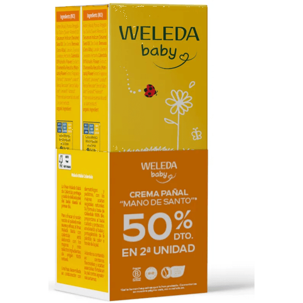 https://www.mifarma.eu/weleda-diaper-cream-2x75-ml802069489368Weleda Baby Diaper Cream 2x75 ml<p><span style="font-weight: 700;">Weleda Diaper Cream 2x75 ml</span><br></p><p> <span style="font-weight: bold;">Diaper cream</span> made from natural ingredients that effectively prevents skin <span style="font-weight: bold;">irritation</span> in the <span style="font-weight: bold;">diaper area.</span><br></p><p> It naturally protects and cares for the delicate skin of the baby.</p><p> It keeps the <span style="font-weight: bold;">little bottom protected</span> and perfectly insulated from moisture.</p><p> It contains <span style="font-weight: bold;">zinc oxide</span> , with insulating and absorbent properties.</p><p> Enriched with <span style="font-weight: bold;">beeswax</span> , which reinforces the effectiveness of the treatment by forming a thin protective layer that does not clog pores.</p><p> <span style="font-weight: bold;">Organic calendula and chamomile extracts</span> soothe and regenerate irritations and redness.</p><p> 100% natural and organic cream.</p>https://assets.atida.com/transform/e3590168-e7cc-4b7b-8a3e-bbacedb9c0b1/Weleda-Baby-Crema-Panal-2x75-ml?io=transform:extend,width:250,height:25012.99instock16.0410.735536190083193.05Weledahttps://www.mifarma.eu/media/catalog/product/2/5/8/4/2584f5275fa60ddd185195bb8541b58de5299dcf_Weleda_Baby_Crema_Panal_2x75_ml.png/Baby and Mom/Baby and Mom/Diapers and Changing/Natural and Organic Cosmetics/Baby and Mom/Diapers and Changing/Diaper Cream/Mini Prices/Up to 70% off2024-09-16T06:17:17+0000